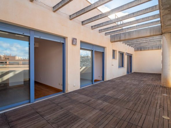 The property features a spectacular 43 m² terrace, ideal for enjoying the outdoors, hosting gatherings with friends, or relaxing all year round. Inside, it offers three bedrooms, all with fitted wardrobes, and two full bathrooms, one of them en suite in the master bedroom.