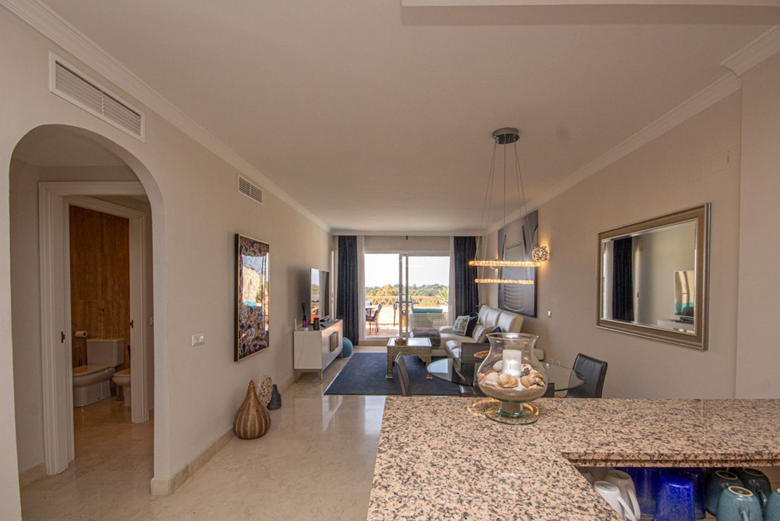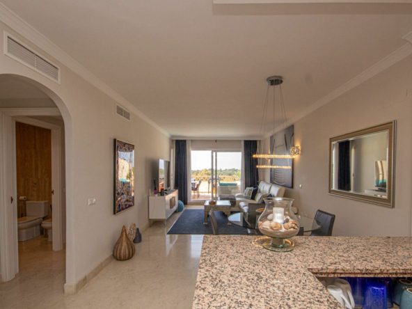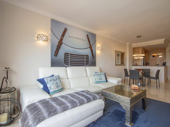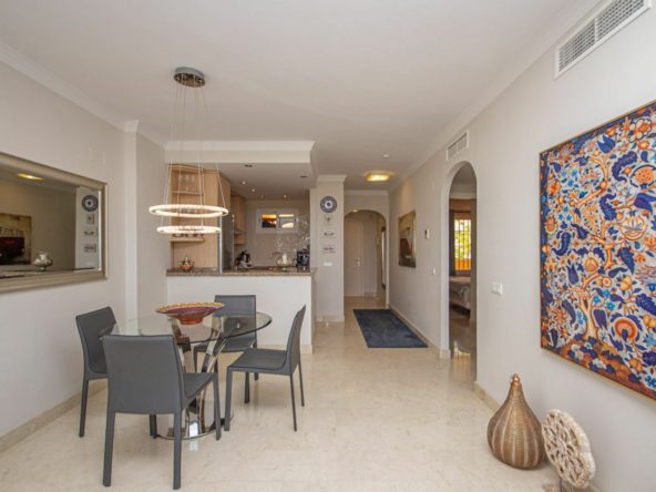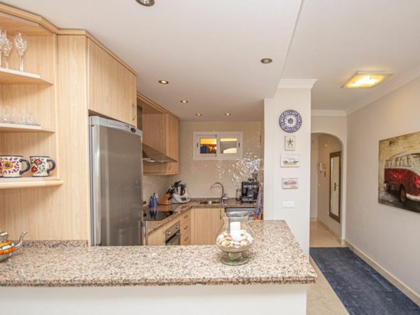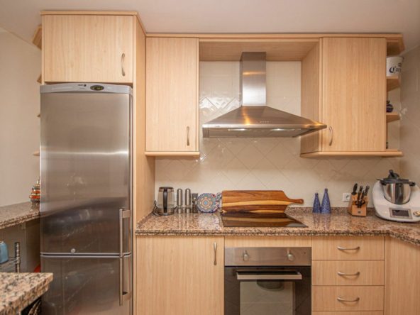 The open-plan kitchen seamlessly connects to the bright living area and sunny terrace. The apartment is sold fully furnished and is in excellent condition, ready for immediate use. Additional features include ample built-in wardrobes and a separate utility room for added convenience. The AC unit has just been replaced and comes with warranty