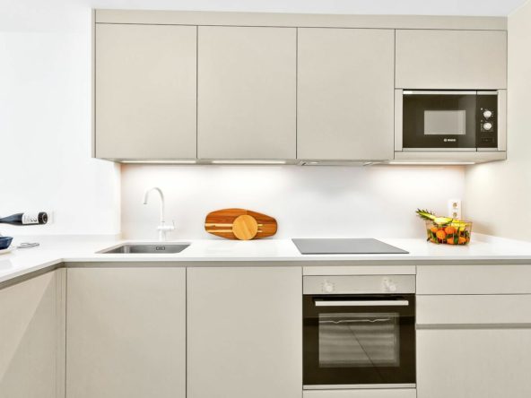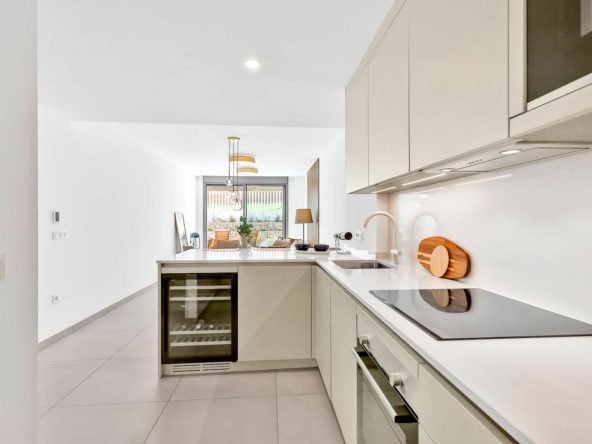 Thanks to its west-facing orientation, the apartment enjoys sunlight from midday all the way through to sunset — perfect for long outdoor dinners or relaxed evenings on the terrace. The fully fitted kitchen comes with quality appliances including a wine fridge, and there is also a separate laundry room with a washing machine.