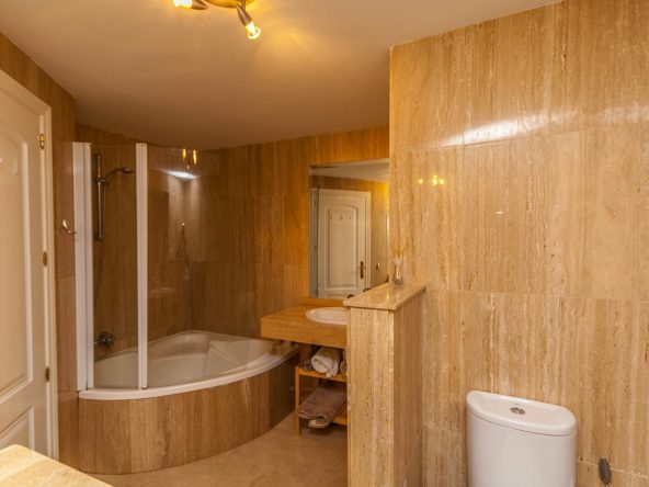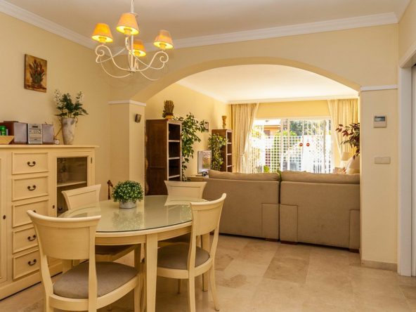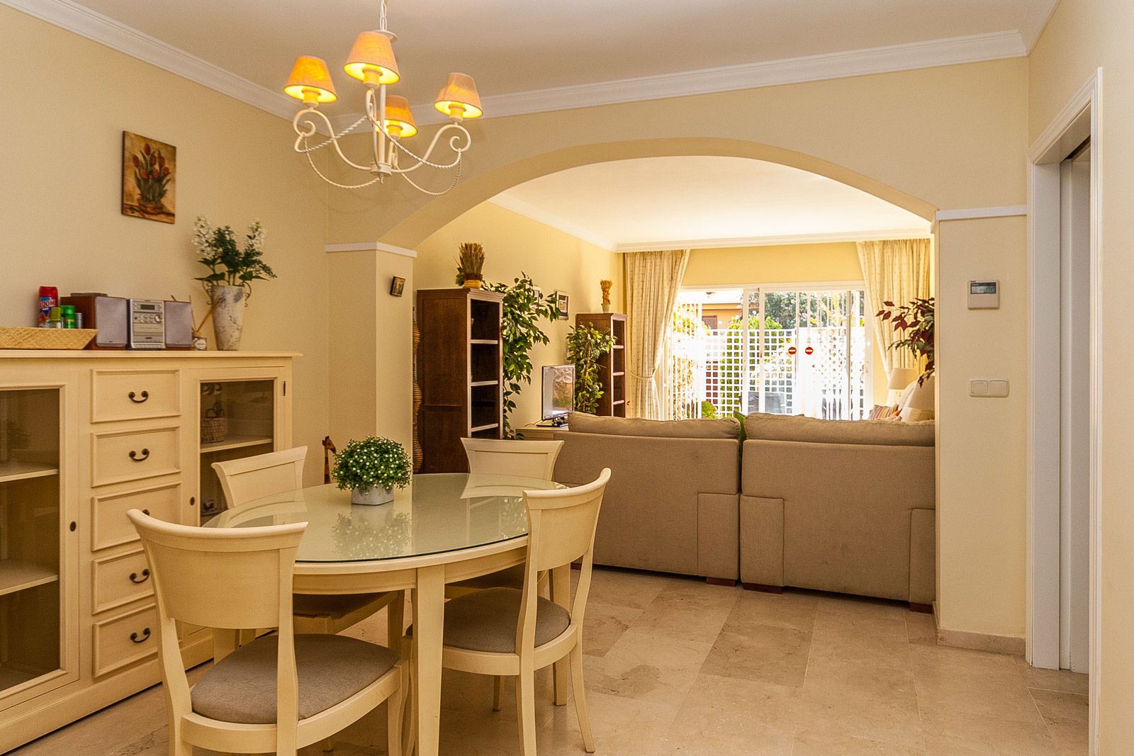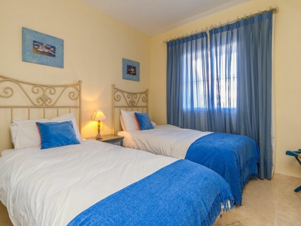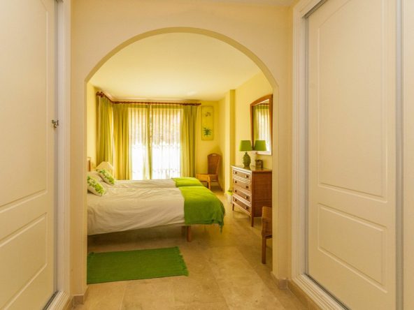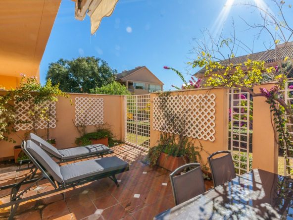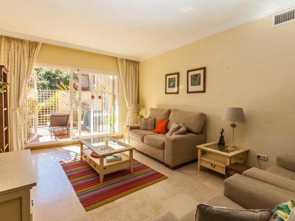 Bright and sunny ground floor apartment in the sought after community of Los Jardines, just around the corner of the 18-hole Santa Maria Golf Course. The community is fully gated and offers 4 outdoor swimming pools surrounded by landscaped gardens, 24-hour security and underground (private) parking spaces and storage rooms. The apartment is south facing and consists of two bedrooms with two bathrooms, a fully fitted kitchen with all appliances and a utility room, an ample lounge/dining area and a sunny terrace with direct garden access. Walking distance to local shops, restaurants, supermarkets and the beach!