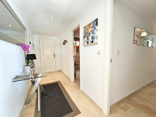 This fantastic 2 bedroom, 2 bathroom apartment is located in the popular area of Elviria, Marbella. Located in a front line golf development with 4 swimming pools, this property boasts fabulous open sea and mountain views and is just a few minutes drive from all amenities. Located in Los Lagos de Santa Maria, this first floor apartment has a large terrace with enough space for dining table, sofas and sun beds.The apartment comprises of 2 spacious bedrooms, 2 marble bathrooms (one ensuite), and a lovely bright sitting room/dining room that takes you straight onto the large terrace. The kitchen is fully fitted with a handy laundry/utility room and there is hot and cold A/C throughout the apartment. The configuration of this apartment cleverly allows the possibility of opening up the kitchen and creating an open plan living area if wanted by the new owners.