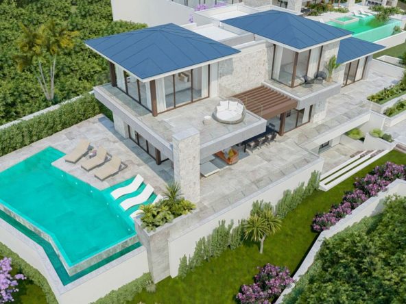 Upper Level: Master bedroom suite with ensuite bathroom and private terrace offering spectacular sea and mountain views.