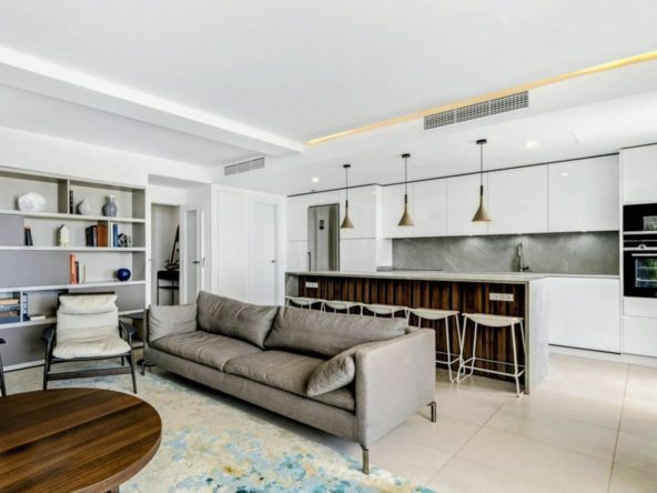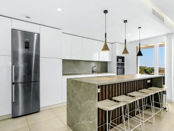 On the first level, we find an open-plan living area, bright and spacious, with raised ceilings that give this particular apartment a feeling of openness as you walk in. This penthouse has beautiful Porcelanosa flooring throughout, and a well-equipped kitchen that features a gorgeous newly reformed countertop island, perfect for entertaining or enjoying a relaxing brunch. All ceiling lights throughout the house are energy-efficient and feature invisible elements.