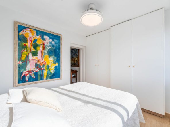 Originally a large one bedroom, this was converted to 2 bedrooms and one bathroom. As you enter the apartment, you are welcomed by the large open hallway that leads straight into the open plan lounge, decorated beautifully with high end furniture and fixtures. A cute white kitchen is to the right of the entrance and opens onto the dining room and lounge. Continue through the lounge and you come to the expansive, beautiful terrace that is facing the pool and south!