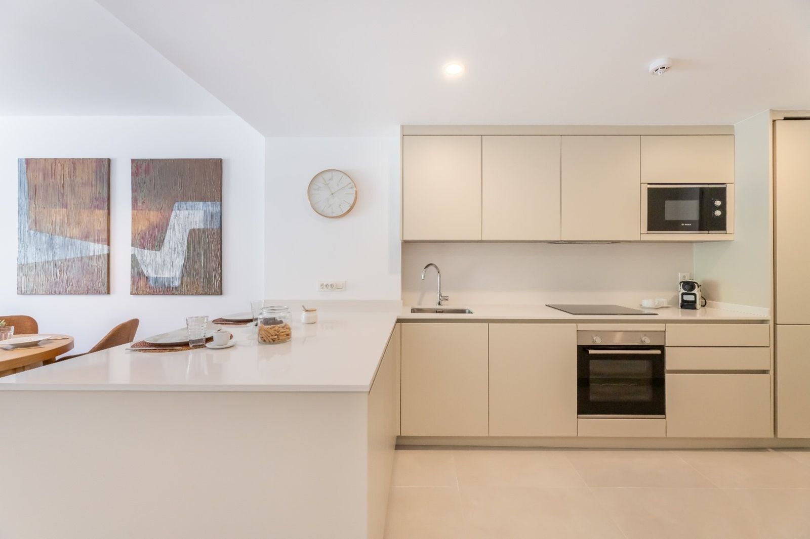 The apartment benefits from a south-east orientation and enjoys views over landscaped gardens and green areas, providing excellent natural light throughout the day and a sense of tranquillity. The interior comprises two bedrooms, two bathrooms, a spacious living room seamlessly connected to the dining area and kitchen, as well as a separate laundry room and an additional storage space.