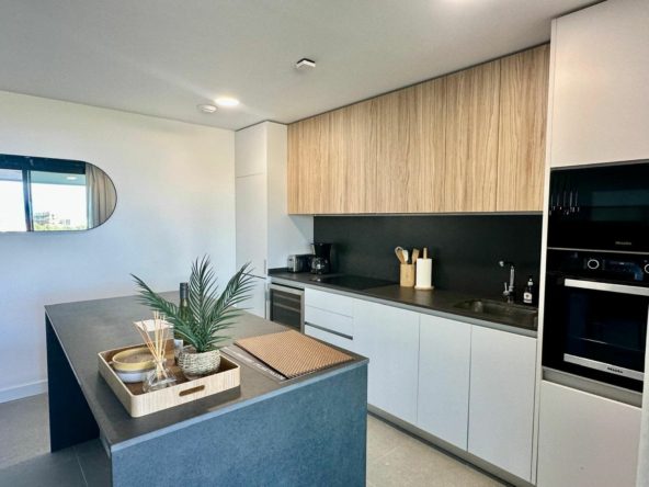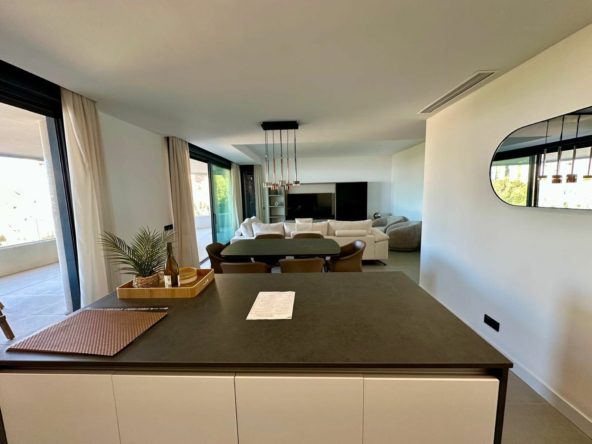 The apartment boasts a generous built area of 112m² and features 3 well-proportioned bedrooms and 2 bathrooms, including a luxurious en-suite master bedroom. The living spaces are thoughtfully designed, with an open plan, fully fitted and equipped kitchen that flows seamlessly into a spacious dining room and living room. Both rooms open onto a private covered terrace, presenting panoramic views of the sea, mountains, countryside, gardens, and communal pool. A stunning terrace of 22m2 with panoramic views. Double glazing, air conditioning, and fitted wardrobes add to the comfort and practicality of the home.
