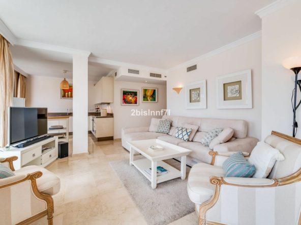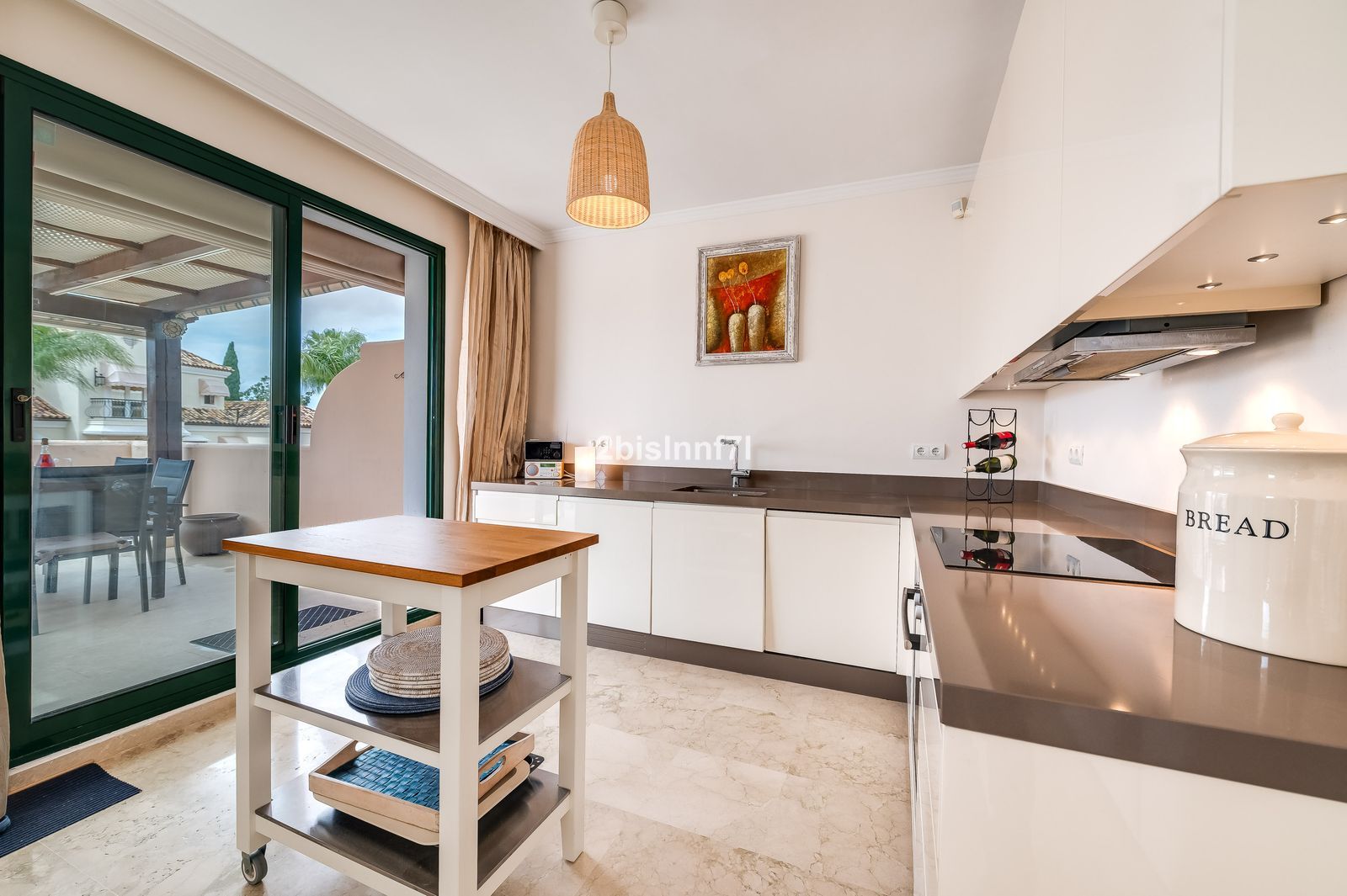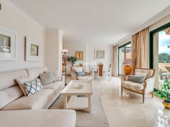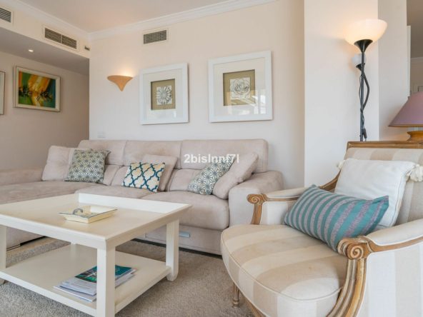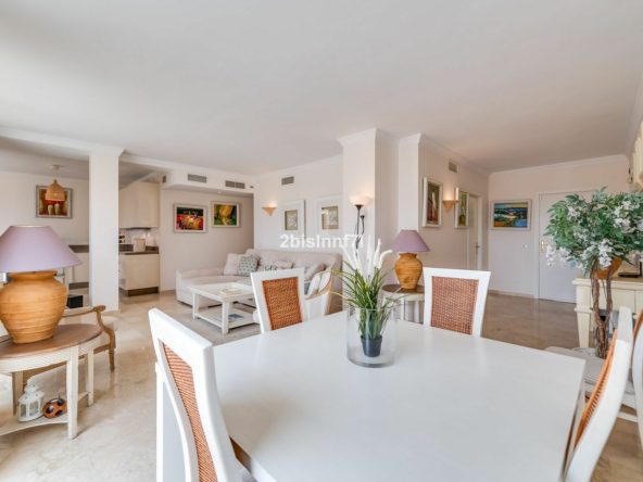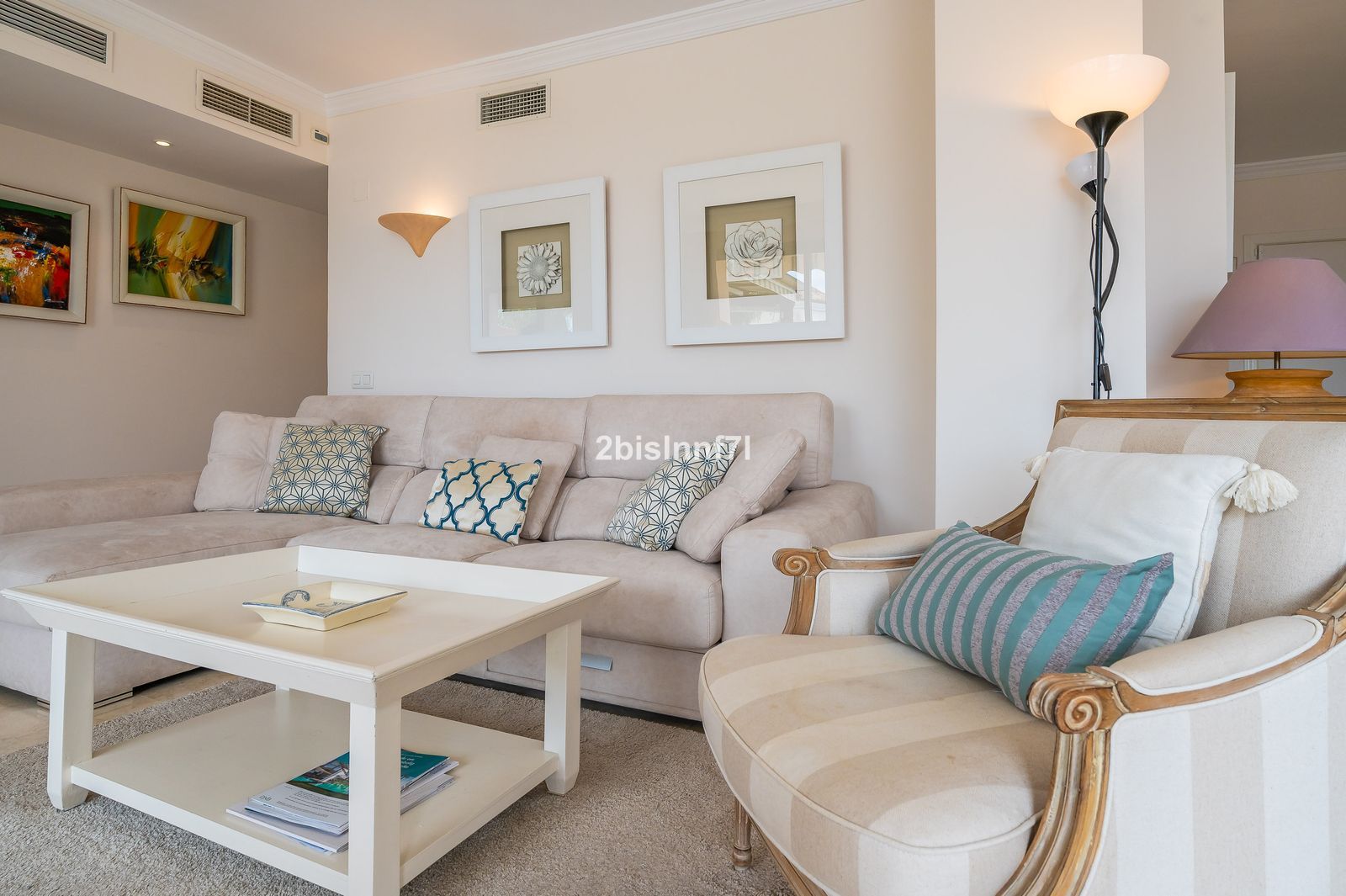 The apartment consists of two generously sized bedrooms and a third smaller one, ideal as a guest room, home office, or children's bedroom. Bedrooms benefits from lovely views of the landscape gardens. The two bathrooms have been renovated and feature underfloor heating for maximum comfort. The kitchen has also been completely renovated with high-end appliances and a modern design. One of the highlights of this property is its spectacular large terrace, with multiple areas to enjoy outdoor living. It features a covered dining space ideal for alfresco meals, a charming chill-out area and a sunbathing zone with longers, all offering beautiful views. Thanks to its excellent orientation, the apartment enjoys sunlight all day long, from 10 AM until sunset. From the terrace you can also enjoy a beautiful sea view on the horizon.