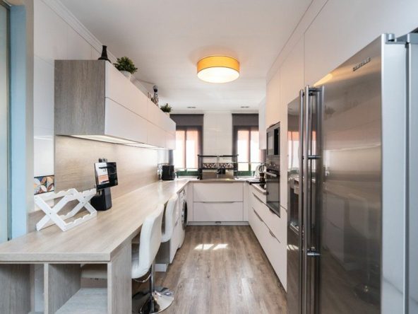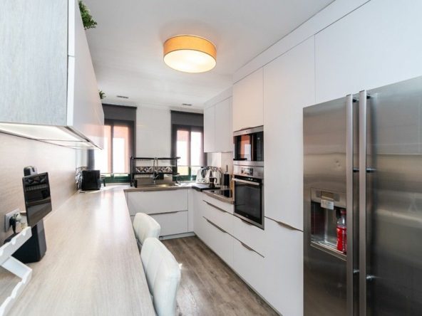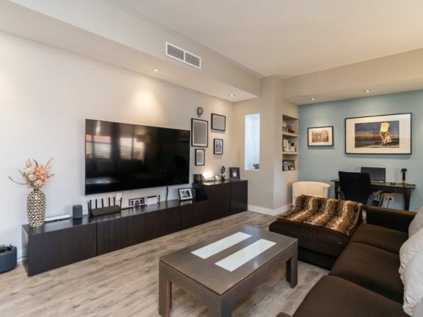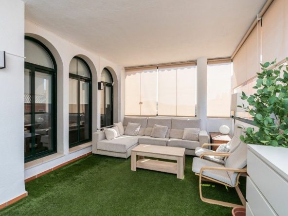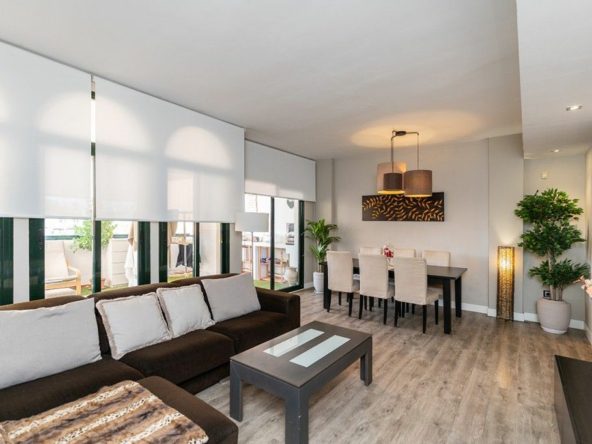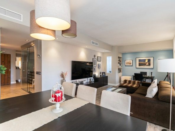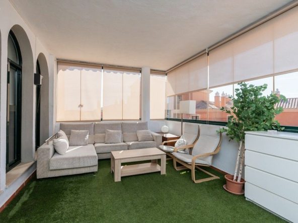 Apartment on one level in the complex El Mirador de Santa Maria Golf in Elviria in East Marbella. The apartment offers three bedrooms, two bathrooms, a fully equipped modern kitchen, a large and bright living room with access to the covered and glazed terrace. Fully refurbished and equipped with AC hot and cold, wooden floors and sold furnished. South orientation. The price includes a double underground parking space and a large storeroom. Gated complex with three pools and gardens just next to the Santa María Golf Course and within a short drive to all amenities as well as the beach. The centre of Marbella and shopping centres are a 10 minutes drive away.