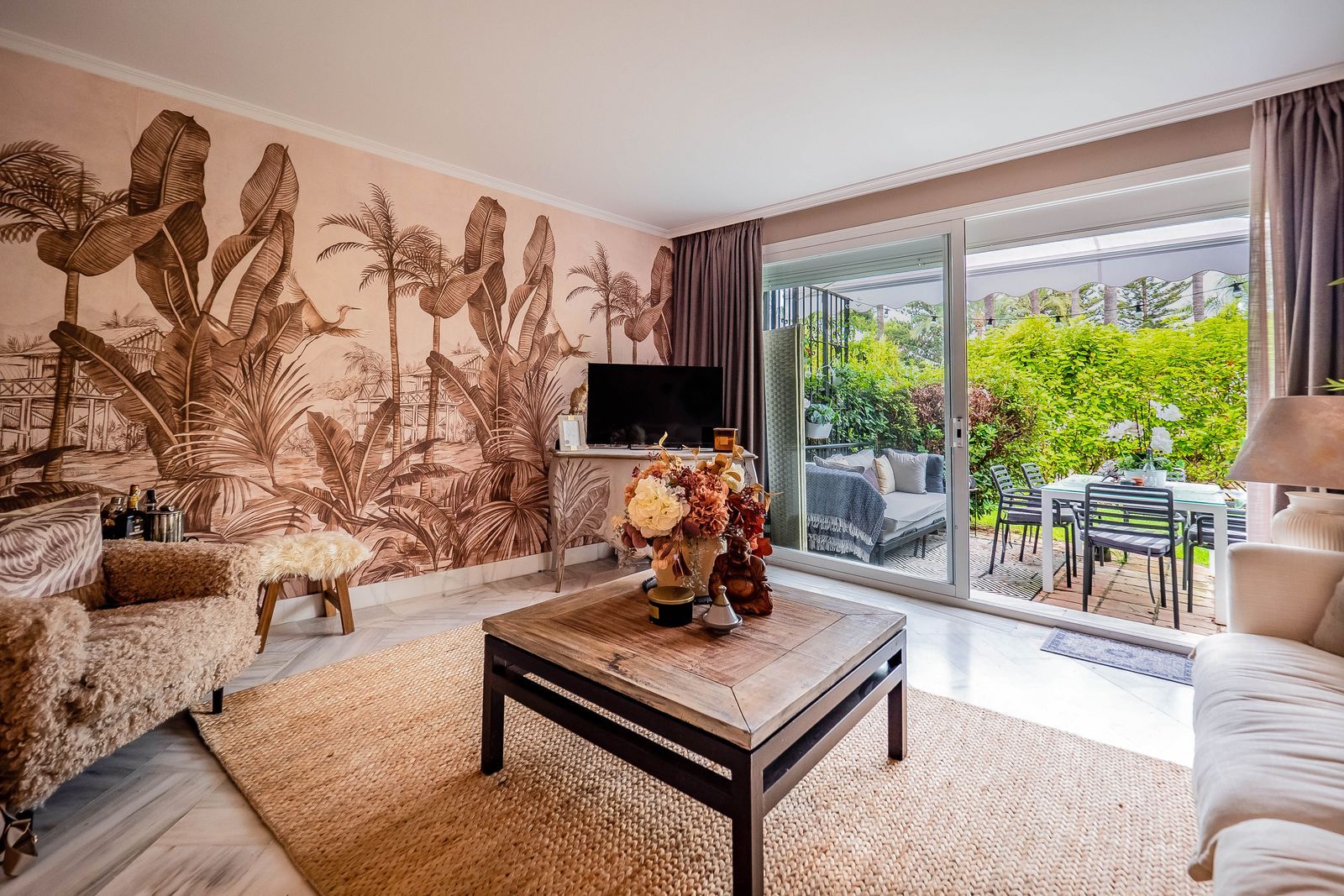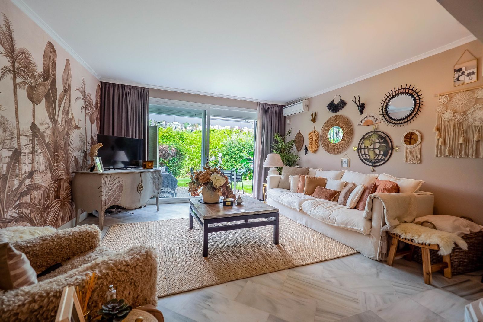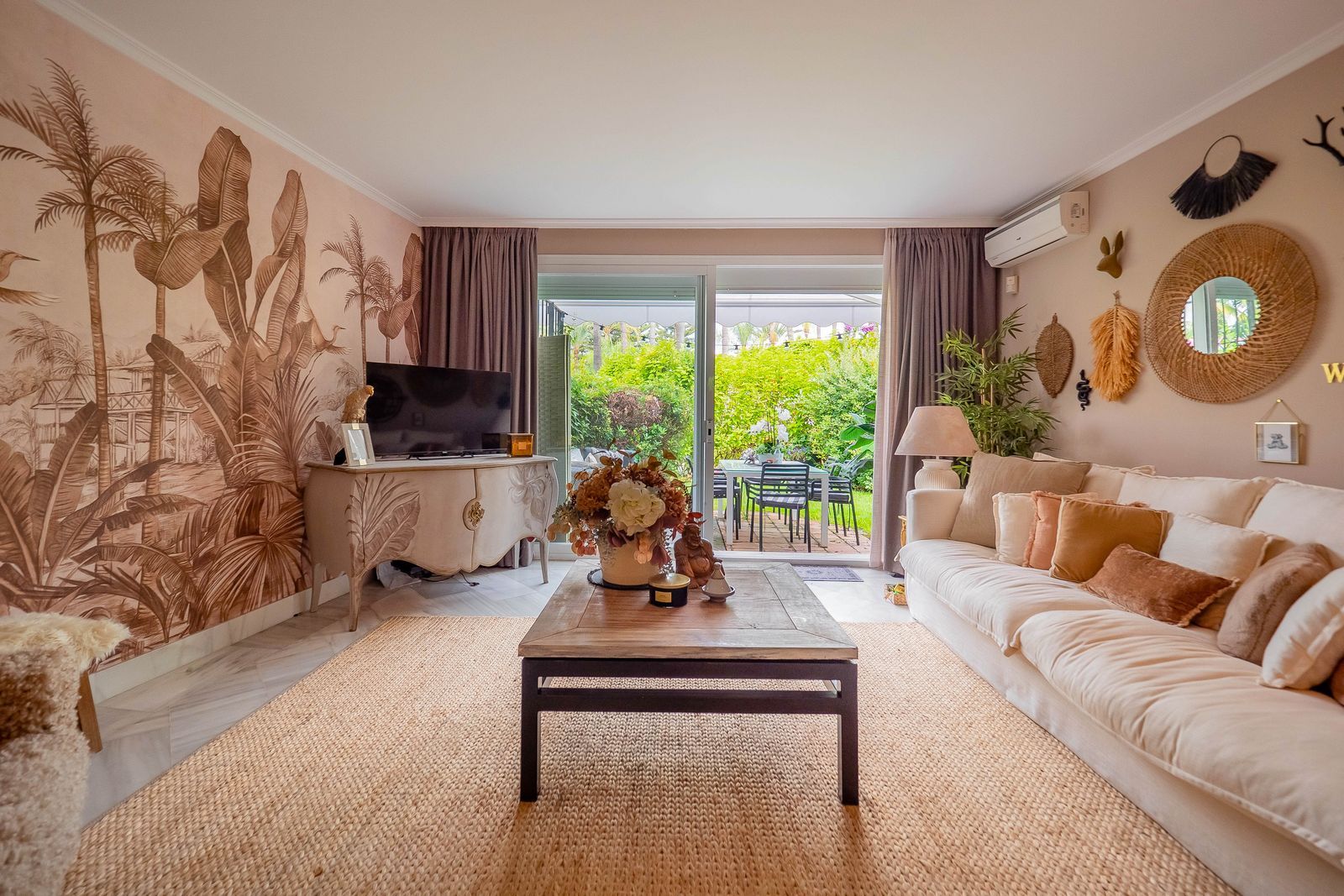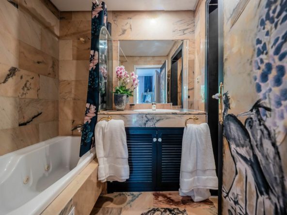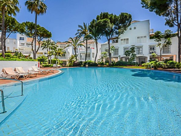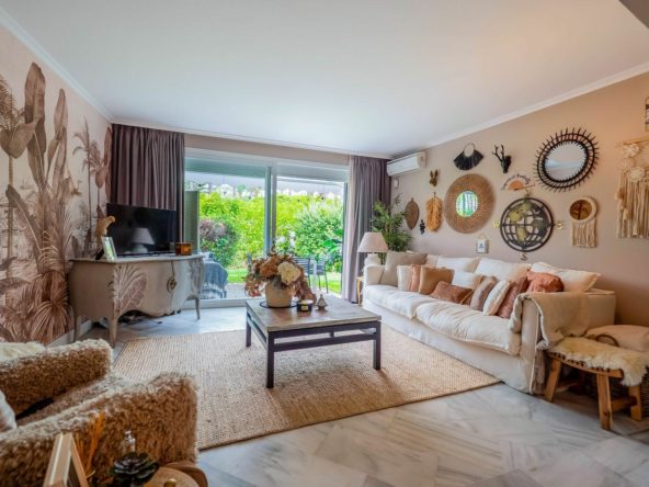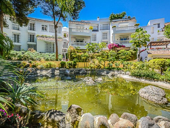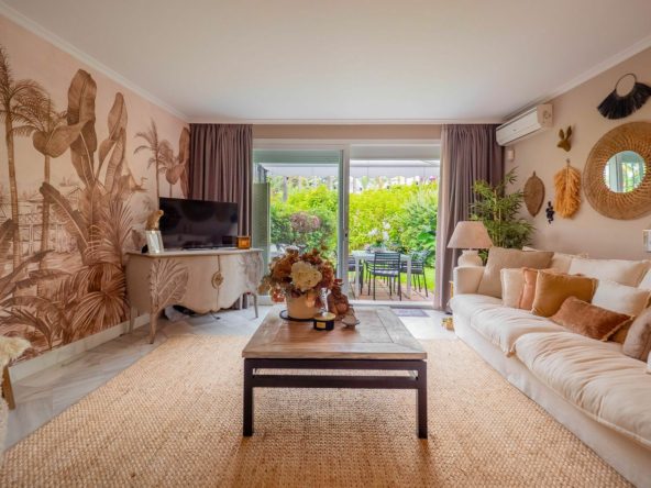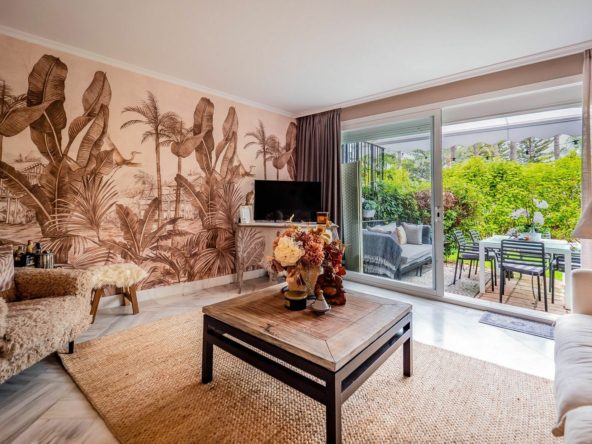 We are pleased to offer this ground Floor apartment in an upmarket development beach side in Elviria. The apartment has been Interior Designed and is tastefully furnished, and a small private garden allows direct access to the stunning tropical gardens and pools, one being heated for the cooler months of the year. The apartment has a large lounge and access to the terrace and garden, fully fitted kitchen guest cloakroom and large master bedroom with walk in wardrobe area and main bathroom. Also included is underground parking space and storage.