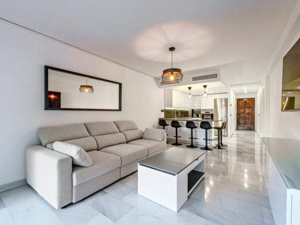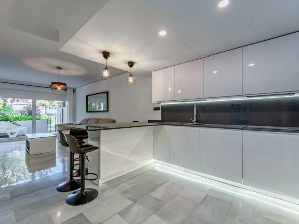 This magnificent ground floor apartment is located in Vivero de Marbella, a quiet, low-rise residential complex in the prestigious Sierra Blanca area on Marbella’s Golden Mile, between Imara and Le Blanc. Recently renovated with high-quality materials, the apartment offers a modern open-concept layout. It features a fully equipped kitchen with a breakfast bar and a bright living-dining area that opens onto a cozy terrace with outdoor sitting and dining areas and direct access to the communal garden. The master bedroom includes an en-suite bathroom and access to a private balcony, while the other two bedrooms share a bathroom. All bedrooms have built-in wardrobes, and there is also a practical separate laundry room. The complex is very well maintained and offers beautiful gardens with water features, a swimming pool, and communal parking. It’s an ideal place to enjoy peace and comfort in one of Marbella’s most exclusive areas. With a tourist license in place, the property presents an excellent investment opportunity.