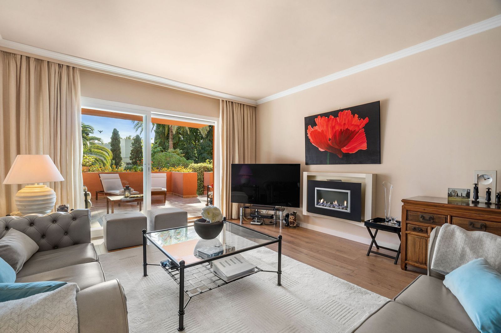 Just a short walk from the beach, this spacious two-bedroom apartment offers direct access to the beautifully maintained garden and swimming pool via a wide private terrace.