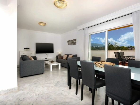 Welcome to this beautifully presented 2-bedroom, 2-bathroom penthouse located in the sought-after community of La Dama de Noche, just a short walk—1,000 meters—from the beach and the vibrant heart of Puerto Banús