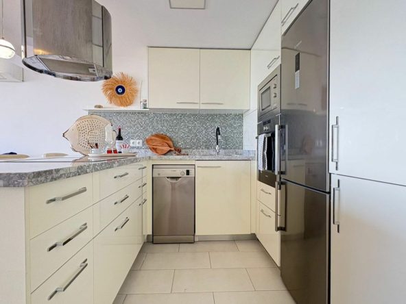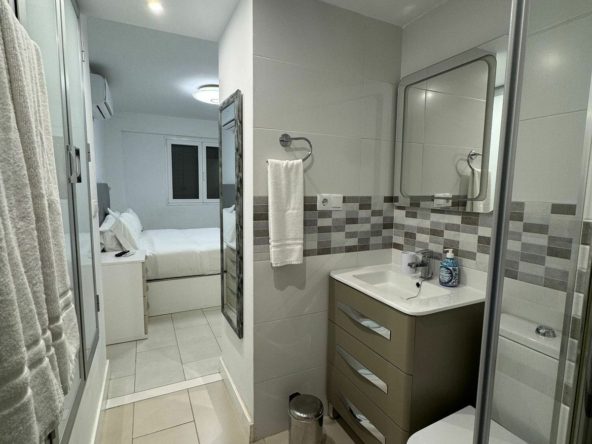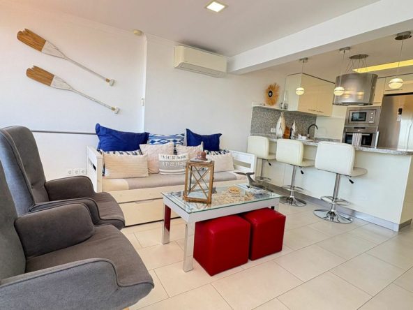With panoramic sea views from the living room, this beautifully renovated apartment features a master suite bedroom, an additional full bathroom, and an inviting living area with sofa beds. The open American kitchen blends seamlessly into the space, ideal for relaxed mornings or entertaining friends.