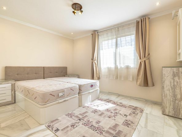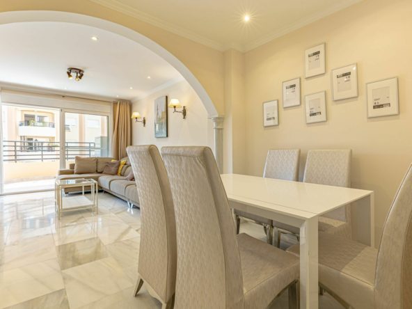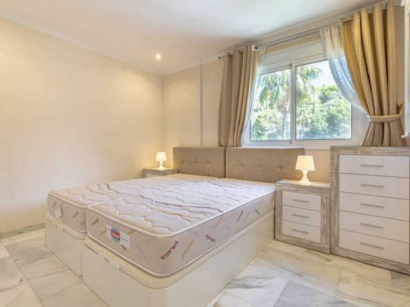Impeccable corner apartment on the fifth floor with views of the pool and morning sun. The property has been completely renovated and is ready to move into. It has a living-dining room with access to the terrace, a fully equipped kitchen with a laundry room, a master bedroom with an en-suite bathroom and built-in wardrobes, and two further bedrooms, each with its own bathroom. Being on the corner, the property enjoys plenty of natural light. The car park is communal and enclosed with a gate. The building has a communal garden and swimming pool. Located in the heart of the city, just a stone's throw from Marbella's promenade and the beach.