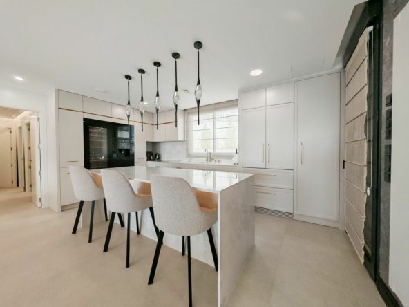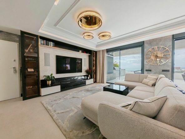 Penthouse for sale in , Marbella with 3 bedrooms, 3 bathrooms, 1 on suite bathroom and with orientation south/west, with communal swimming pool and private garage (2 parking spaces). Regarding property dimensions, it has 247.7 m² built, 114.5 m² interior and 123.9 m² terrace. Has the following facilities mountainside, air conditioning, fully fitted kitchen, utility room, guest room, storage room, gym, alarm, security entrance, double glazing, video entrance, brand new, barbecue, security service 24h, guest toilet, private terrace, sea view, country view, mountain view, golf view, underfloor heating (throughout), security shutters, smart home system, internet – wi-fi, covered terrace, electric blinds, lift, panoramic view, close to children playground, close to golf, uncovered terrace, glass doors, balcony, wheelchair-accessible, recently renovated / refurbished, close to town, surveillance cameras and pets allowed.