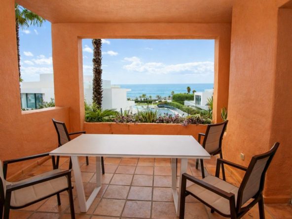 Located in the prestigious Golden Mile of Marbella, this beautifully presented two-bedroom, two-bathroom apartment offers a luxurious lifestyle in one of the Costa del Sol’s most sought-after locations. Set within a secure gated urbanisation with 24-hour security, the property is just a short stroll from the beach and moments from the centres of Marbella and Puerto Banús, as well as top-rated restaurants, international schools, and all essential amenities. Built in 2001, the apartment offers a generous 124 m² of built space and benefits from a south-east orientation with good sea views. The spacious living and dining area opens directly onto the terrace, which is also accessible from the master bedroom. Accommodation comprises two double bedrooms with fitted wardrobes and two bathrooms, including an en-suite to the master bedroom. Finishes include marble flooring throughout, air conditioning, and a fully fitted kitchen. The property is sold with underground parking and a private storeroom. The apartment is set within immaculate communal gardens and residents enjoy access to a large swimming pool, gymnasium, sauna, and jacuzzi.