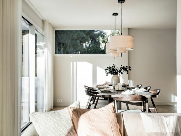 Upon entering, you are welcomed into expansive social areas featuring a bright living room, a fully equipped kitchen, and a sophisticated dining area. Large windows effortlessly connect the interior spaces to the private garden, creating a harmonious indoor-outdoor living experience.