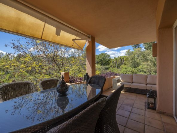 The apartment is in very good condition and comes fully furnished, ready for immediate occupancy or short-term rentals. Inside, you'll find a spacious and airy layout with a bright living area, a fully fitted kitchen, a separate laundry room, and generously sized bedrooms with fitted wardrobes. The marble flooring throughout adds a touch of elegance, while the west-facing orientation allows for lovely natural light and tranquil views of the lush greenery surrounding the complex.