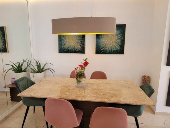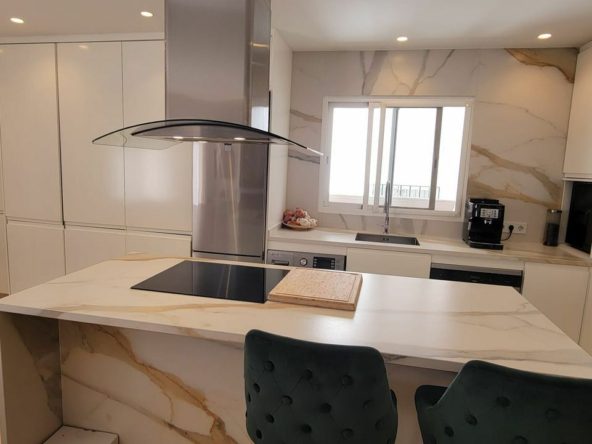 The property features two spacious bedrooms, two bathrooms, a semi-open kitchen with an island and modern integrated appliances, and a bright living area that connects to two generous terraces. From here, you can enjoy open views of the mountains and gardens.