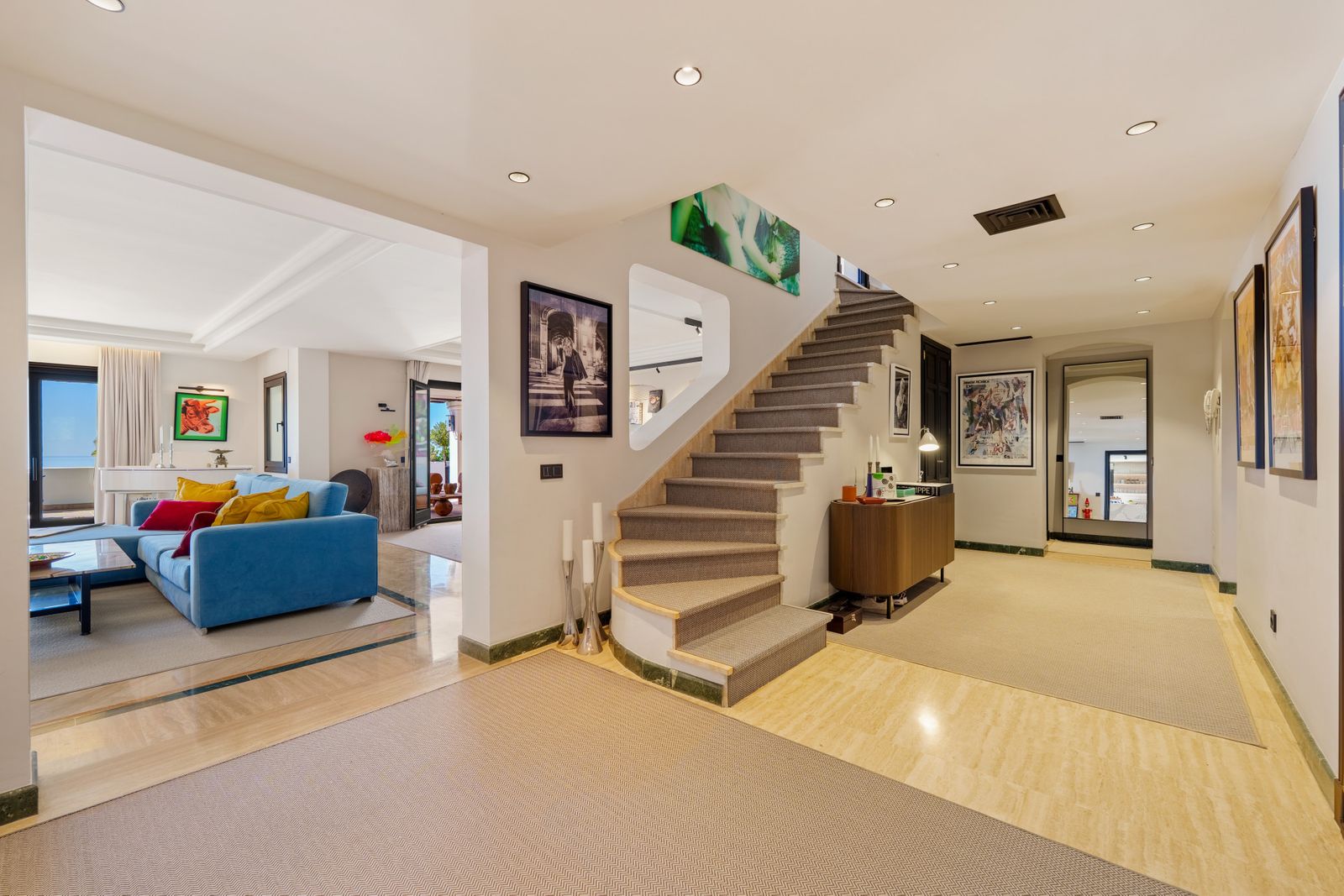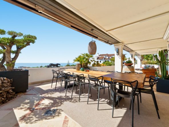 The home flows seamlessly onto generous terraces, ideal for outdoor living and entertaining while enjoying panoramic views of the Mediterranean Sea, Marbella’s coastline, and La Concha mountain. Multiple seating and dining areas allow you to embrace the Marbella lifestyle, whether lounging in the sun, hosting friends, or dining al fresco with a breathtaking backdrop.