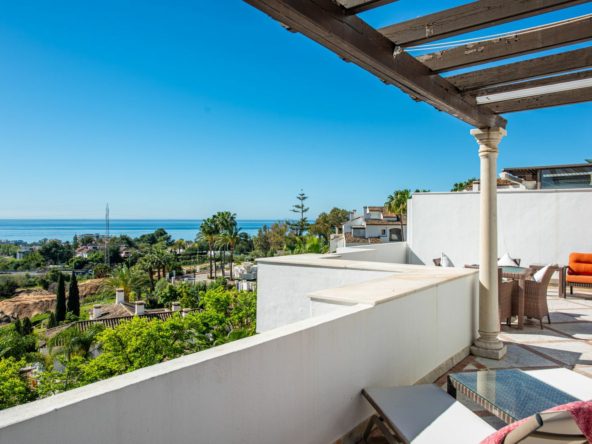 Spacious first floor apartment with panoramic sea views, three double ensuite bedrooms, a large lounge, separate kitchen and utility room, as well as a large terrace. Centrally located within a high end urbanisation within walking distance of the amenities of Marbella old town, in one of the best areas of the Costa del Sol, the apartment boasts impressive views, and oversize rooms throughout.