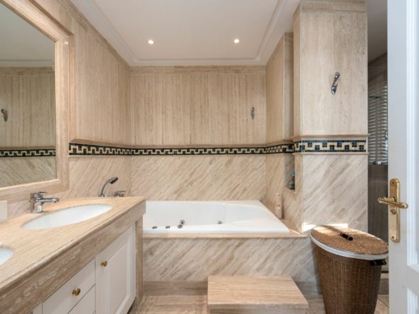 The property is classically appointed and comprises a large lounge with open fireplace, as well as three double bedrooms, each with its own ensuite bathroom; including the owners' bedroom suite which offers sea views and direct access to the terrace, as well as an oversize bathroom with jacuzzi bathtub, double basins and a walk-in shower, as well as a separate dressing area. There is a fully equipped kitchen which has Siemens appliances, a double American fridge, and a separate utility room with its own small terrace.