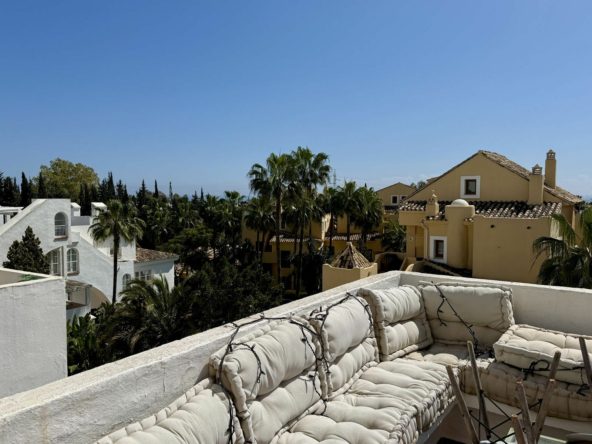 Duplex apartment with south facing terraces, solarium, parking and storage in Rocamar, Nagüeles, Marbella Priced for quick sale at just 465,000€.