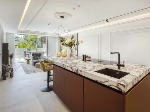 The materials and finishes are of the highest quality, using big format tiles from the likes of Porcelanosa and Ascale for the living areas. Floor to ceiling aluminium windows from brand Cortizo allow for direct terrace access and flood the property with natural light. The living and kitchen spaces are open plan, allowing a seamless flow between spaces. The bespoke kitchen comes fully equipped with brand new Siemens appliances and boasts a stunning marble island worktop.
