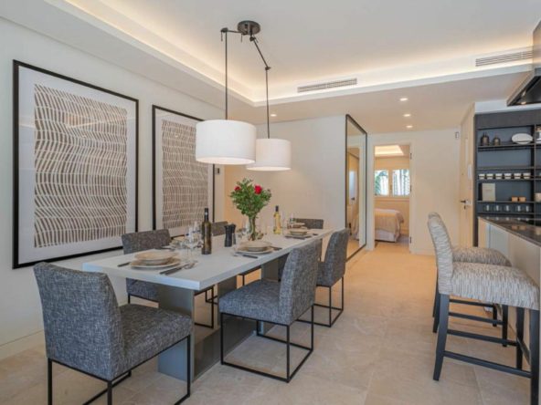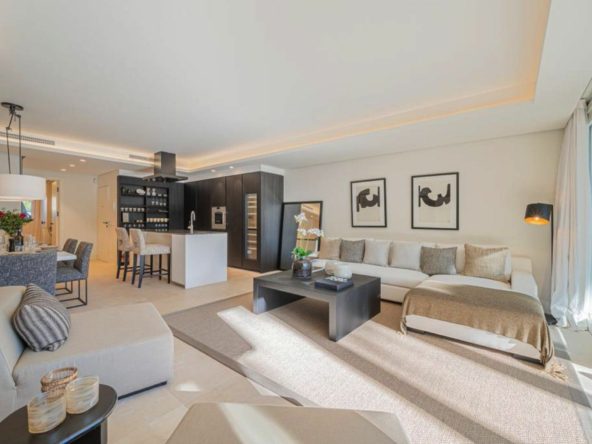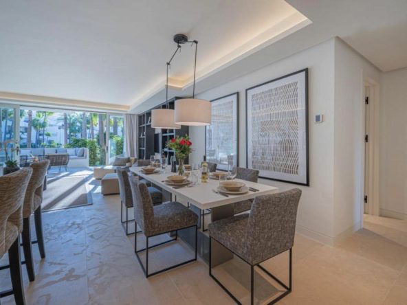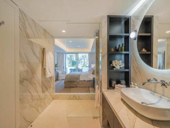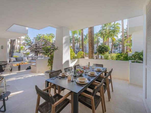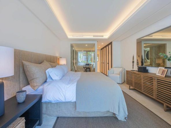 Located within the exclusive 5 star resort Puente Romano in the heart of the Golden Mile of Marbella, this unique apartment sports bespoke interiors combined with the highest quality standards. Effortless indoor-outdoor living with an expansive terrace overlooking the magical Japanese garden and only steps away from the golden beaches of Marbella. The property has a large south-east facing terrace area with direct access to the communal pool and the beach just a few steps away. Offering an open plan layout, a modern kitchen custom designed with oak cabinetry and integrated Gaggenau appliances. Complete with 3 sizeable bedrooms, each one exhibiting a refined contemporary design complete with its private ensuite bathroom. Private parking and storage room included.