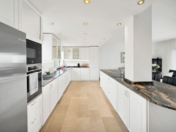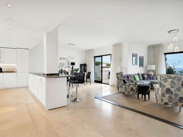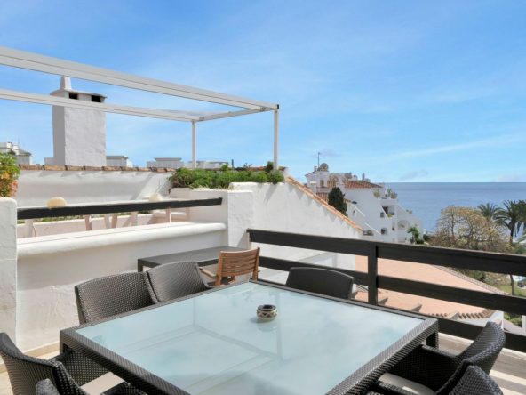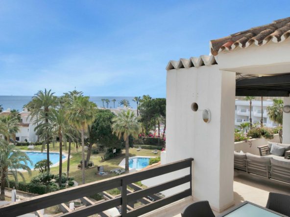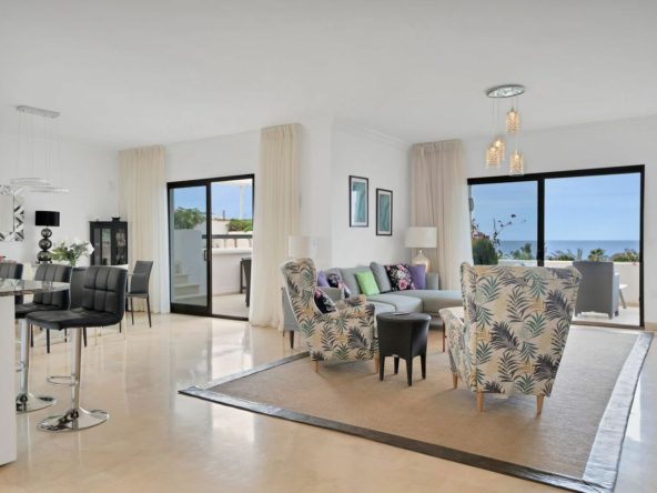 This luxurious penthouse, located on Marbella's prestigious Golden Mile in the Coral Beach complex, epitomizes beachfront living. The property features three spacious bedrooms and two elegant bathrooms, providing ample comfort and privacy. The highlight is a 74 m² terrace with breathtaking panoramic sea views, ideal for outdoor dining and relaxation. The interiors are bathed in natural light, complemented by a modern open kitchen with stunning mountain views. Residents enjoy access to lush tropical gardens, a large communal pool, and direct beach access. The penthouse also includes underground parking and storage space. Its prime location offers proximity to renowned restaurants, luxury hotels, and prestigious golf courses, making it perfect for those seeking a sophisticated Marbella lifestyle.