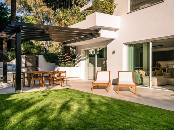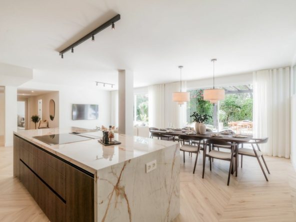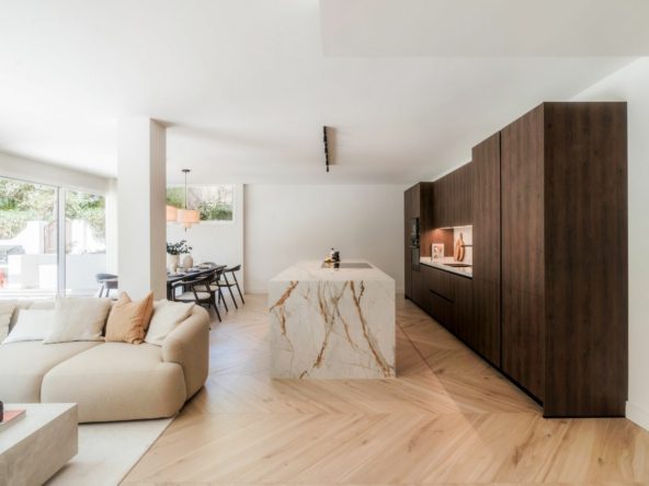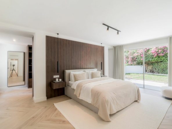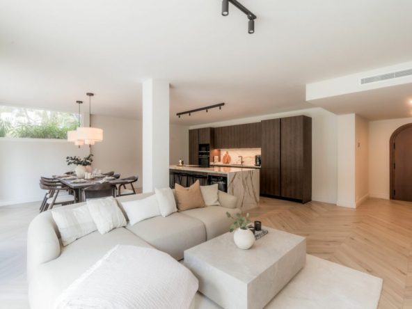 This luxurious 4-bedroom ground floor apartment is located in the heart of Marbella’s Golden Mile, offering the blend of apartment and villa living. The property spans a total of 470 m², including 229 m² of built space and a large 241 m² private garden. The living spaces are designed for comfort and luxury, with large windows connecting the indoor areas with the large private outdoor garden, creating a natural light throughout the apartment.