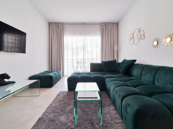 The apartment has a modern, fully equipped kitchen, a large master bedroom with en-suite bathroom, and a second bathroom with a jacuzzi and shower. The interior has been renovated in a modern style with high-quality materials.