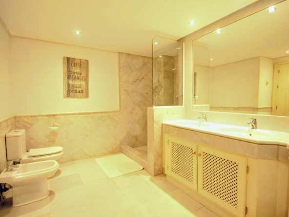 The master bedroom has wonderful sea views, built-in wardrobes, and a large en-suite bathroom complete with a shower and bathtub.