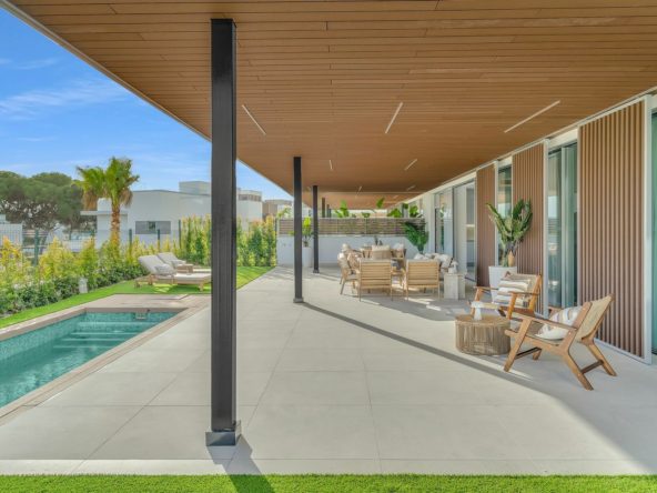 The spacious open-plan living and dining area flows effortlessly onto a large covered porch, private garden, and private swimming pool, creating an ideal setting for outdoor living, entertaining, and relaxation all year round.