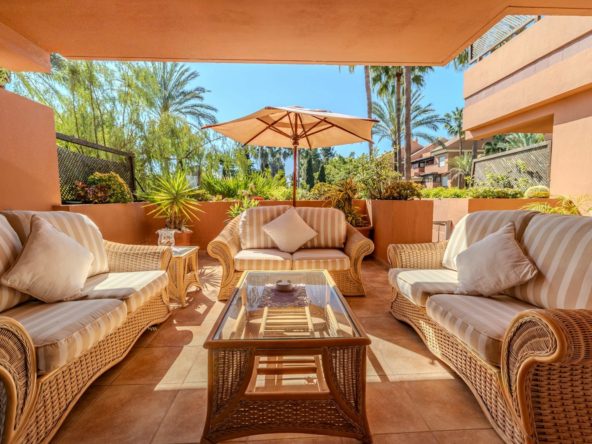 Magnificent ground-floor apartment in the exclusive Embrujo Playa development, one of Marbella’s most sought-after areas thanks to its privileged seaside location and its proximity to Puerto Banús. The property offers two spacious bedrooms and 172 m² of interior living space, featuring generous, comfortable and well-distributed rooms. Its south-facing orientation ensures excellent natural light throughout the day, creating a warm and welcoming atmosphere throughout the home.
