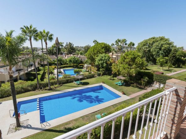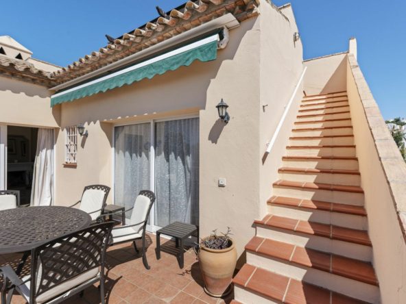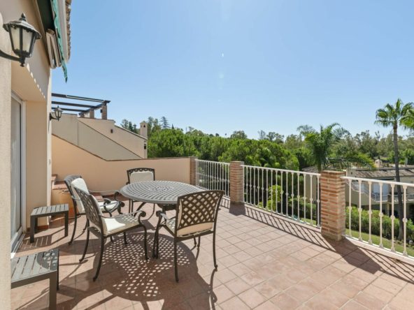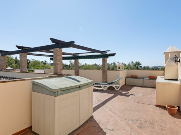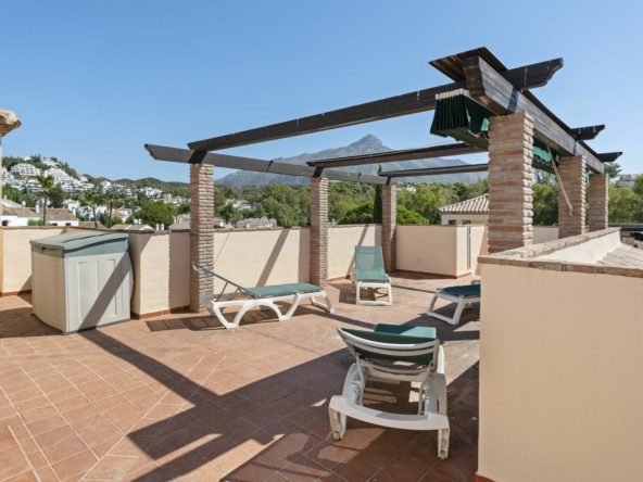 This beautiful 3 bedroom 2 bathroom penthouse nestled in the heart of Nueva Andalucia must be seen. With an expansive terrace and solarium totally nearly 100 sqm means there is a multitude of outdoor spaces to relax with incredible views of the surrounding areas and the iconic La Concha mountain. The main living area and 3 bedrooms are located on the main floor with a great sized balcony over looking the manicured gardens and 2 pools. This balcony gives direct access via an external staircase that has a huge solarium with built in bbq and 360degree views.