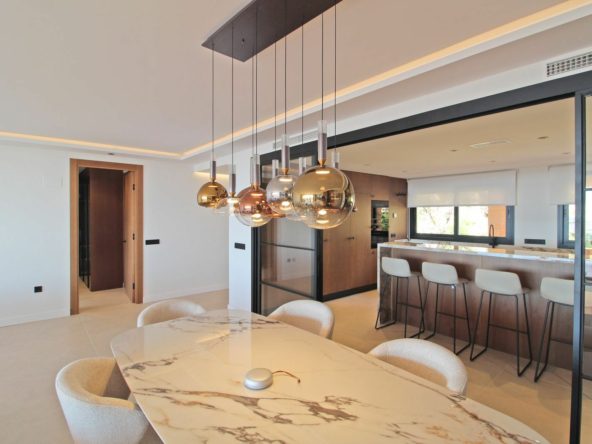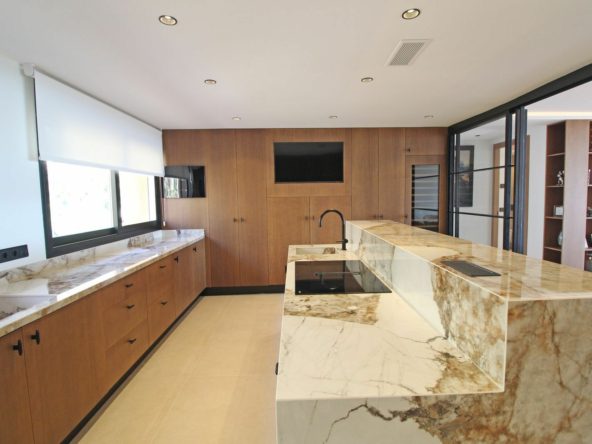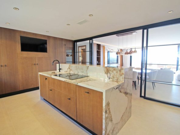 The kitchen is modern and functional, with a central island, high-end integrated appliances, and elegant finishes. It connects to the living area through a glass door, allowing for both openness and privacy.
