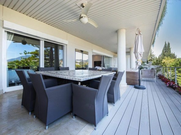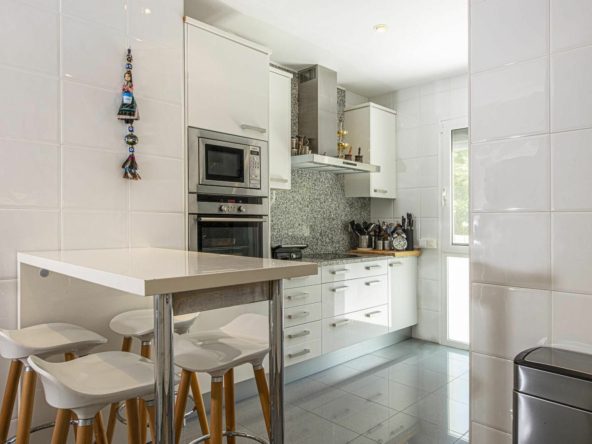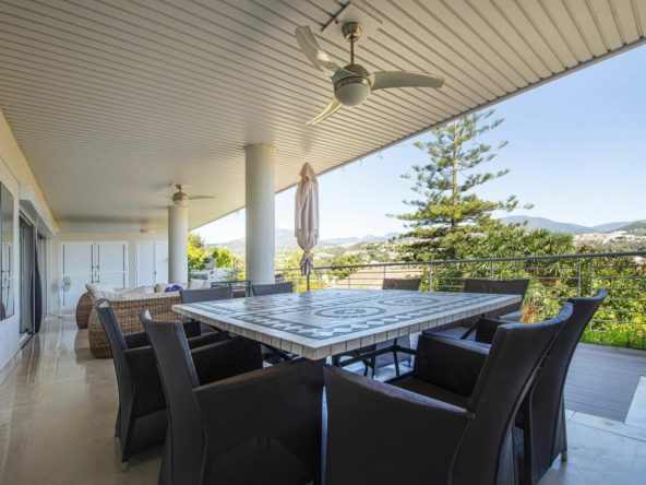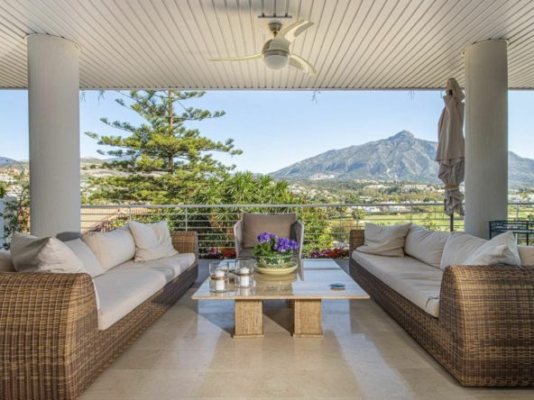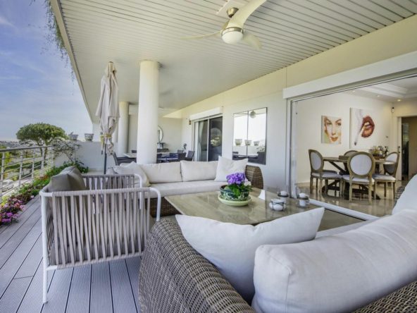 Furnished apartment of 143 square meters inside has 2 large bedrooms, 2 bathrooms, equipped kitchen, living room and a 60 square meter terrace facing east with incredible panoramic views of mountains, golf and sea.