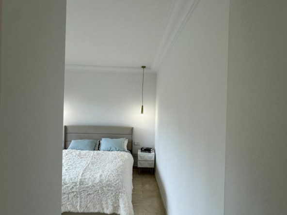 The residence features three bedrooms, each generously sized and equipped with fitted wardrobes for optimal storage. The master bedroom, with its luxurious en-suite bathroom, offers an oasis of tranquility and privacy.