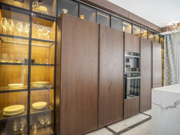 Recently renovated to the highest standard, the apartment showcases exquisite design and craftsmanship throughout. Every element has been carefully curated, with bespoke, made-to-measure furniture and premium finishes that create a sophisticated and warm ambiance. The open-plan living area features a fully fitted designer kitchen, integrated top-of-the-range appliances, and a stylish island dining space. The elegant lounge includes a functional fireplace, enhancing the inviting character of the home.