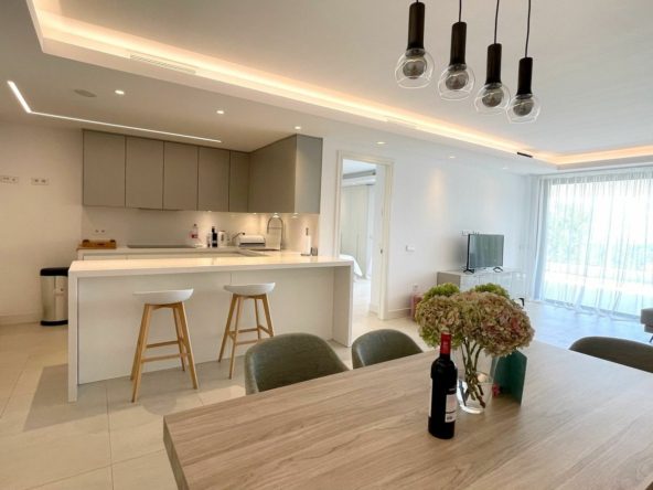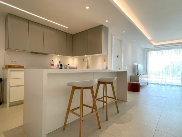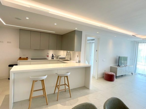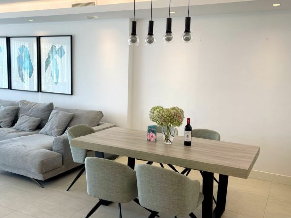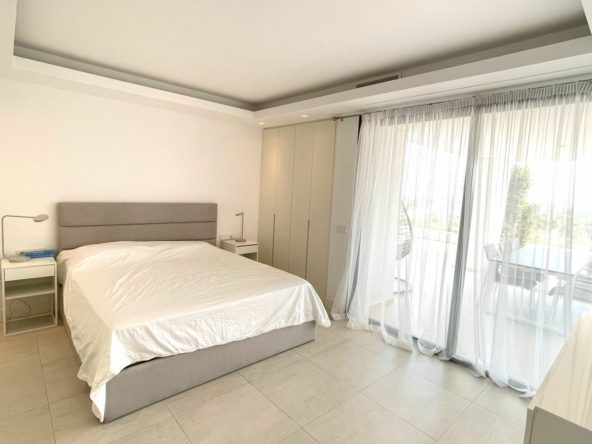 The master bedroom features an ensuite bathroom and direct access to the terrace, offering a serene space to wake up to the beauty of the sea. The additional two bedrooms are well-appointed and share a modern bathroom, ensuring comfort and convenience for family or guests.