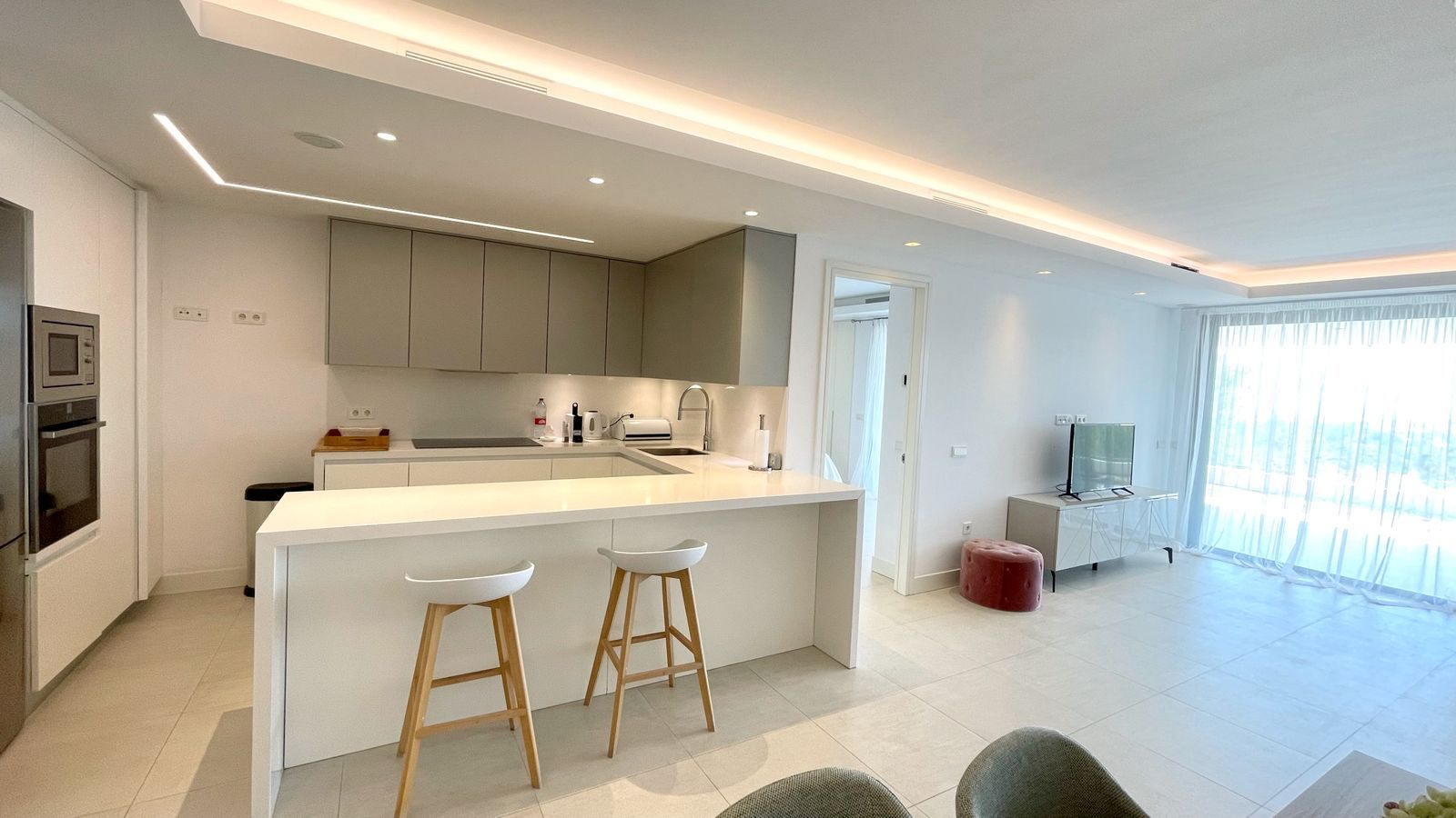 Step inside and be greeted by a spacious, fully equipped kitchen, seamlessly integrated with an elegant living and dining area. The panoramic windows flood the space with natural light and open up to a covered terrace where you can soak in stunning views of the Mediterranean Sea. The terrace extends to a lush, private lawn, providing additional views of the iconic Concha mountain. With both shaded and sunlit areas, the terrace is perfect for outdoor dining, entertaining, or even adding a private pool or Jacuzzi to enhance your outdoor oasis.