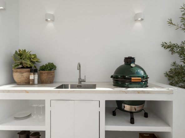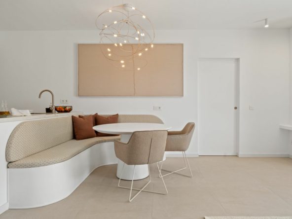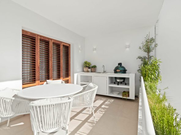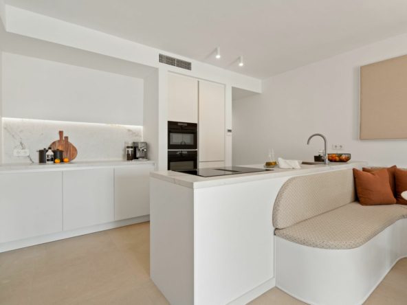 This renovated apartment is located in Alcores del Golf, a south-facing property with plenty of natural light and a clean, minimalistic design. The open-plan layout connects the living area with a modern kitchen, and the large terrace features a barbecue, dining area, and a relaxing outdoor space with views of the garden and greenery.