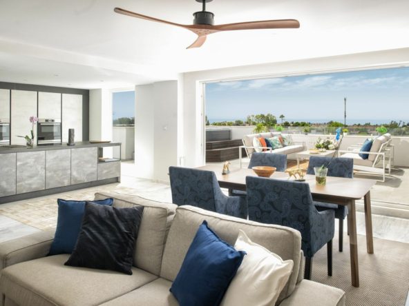 A well located penthouse close to Puerto Banus, the beach & amenities. Situated on a corner gives this property total privacy and the wrap around terrace enjoys both sea & mountain views. Spacious layout with a large family kitchen as the focal point, from here you access the main terrce with a large outdoor kitchen and dining area plus a jacuzzi facing the sea. The bedrooms are situated away from the living area creating privacy and all with access to the terrace. The property is accessed from the underground parking ( 2-3 cars), there is also a large storage room. The urbanisation has 24 hrs security, several pools, basketball and padel courts.
