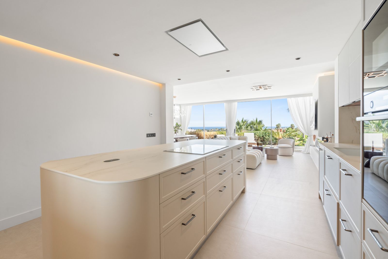 Designed with a contemporary vision, the property combines premium materials, refined aesthetics and functional design to create a modern living environment. The interiors are bright and open, with a spacious living and dining area flowing into a sleek designer kitchen equipped with high-end appliances. Natural tones and clean lines enhance the atmosphere, while large glass doors lead to a south-facing terrace with panoramic views of the Mediterranean and the lush communal gardens below.