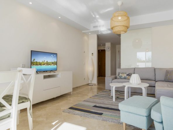 The apartment offers a bright and spacious open plan living and dining area that opens directly onto a private terrace, ideal for enjoying the sun throughout the day. The interior is tastefully designed in soft Mediterranean tones with modern furnishings, a cozy fireplace, and high quality finishes that create a warm and inviting atmosphere.
