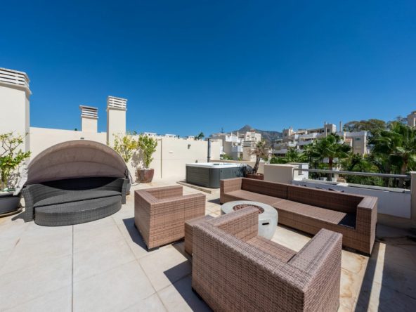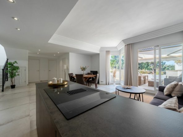 This stunning fully renovated three-bedroom duplex penthouse is located in the prestigious Fuente de Aloha complex in Nueva Andalucía, just minutes from Puerto Banús and surrounded by the best golf courses in Marbella’s Golf Valley.