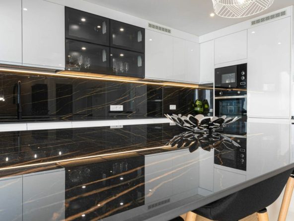The apartment has been recently renovated and furnished in 2023, which means everything is new and modern. The kitchen is an example of elegance and functionality, while the open living room features a fireplace that adds a cozy touch to the space.