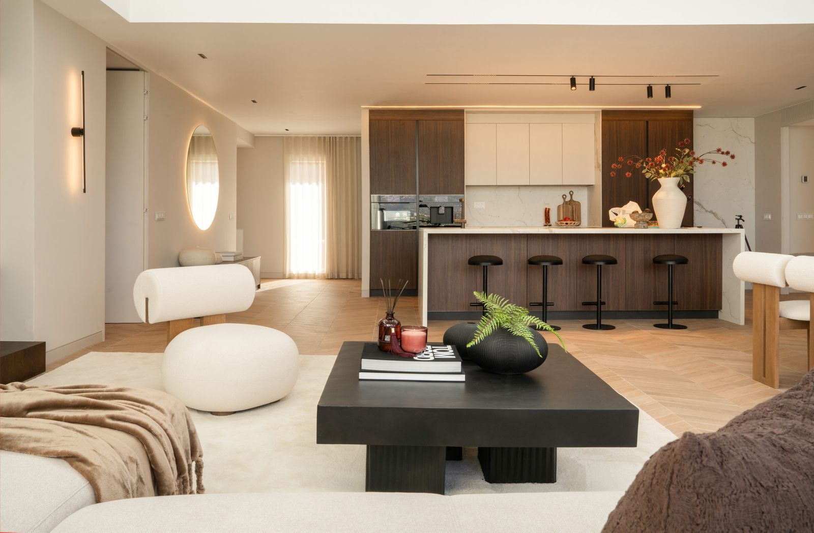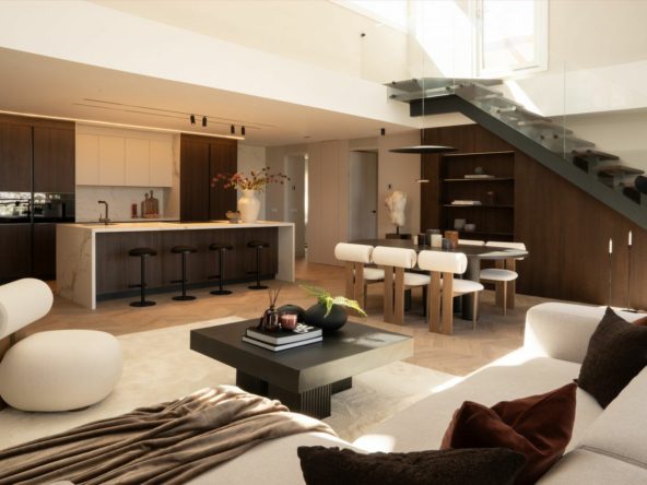 The interior is defined by double-height ceilings and a bright open-plan layout, where the living, dining, and kitchen areas flow seamlessly together. Every element has been carefully redesigned, featuring sleek modern finishes, a stylish open-plan kitchen, and underfloor heating in the bathrooms, ensuring year-round comfort. Sold fully furnished, the penthouse is presented in excellent condition and is ready for immediate occupancy.