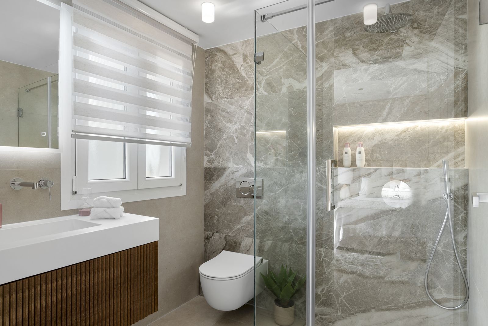 The penthouse includes five beautifully designed bedrooms, including a spectacular master suite on the upper level. With slanted ceilings, a generous walk-in closet, a spa-inspired bathroom, and a private terrace overlooking the sea and La Concha mountain, this is an oasis of complete relaxation. Two additional bedrooms feature en-suite bathrooms, while two share a modern family bathroom. A flexible fifth room serves perfectly as a guest bedroom or office. A separate laundry room with terrace access shows that even the practical details have been given the same attention.